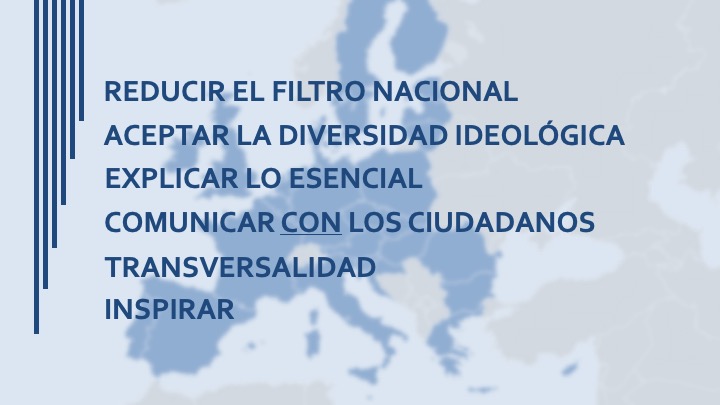 Como soluciones, propuso reducir el filtro nacional en la comunicación diaria, que aplican por igual políticos y periodistas; dar cabida a la diversidad ideológica de la UE para que se visualicen las múltiples formas que hay de ser europeos; explicar menos el funcionamiento institucional y más las medidas concretas y sus efectos en la vida de los ciudadanos; comunicar ‘con’ los ciudadanos, no ‘a’ los ciudadanos, escuchando sus necesidades y ofreciendo soluciones concretas; fomentar la transversalidad, esto es, incorporar la dimensión europea que ya existe en todos los debates, temas, asignaturas y conversaciones, así como fomentar símbolos como un Día de Europa festivo en todo el continente; e inspirar, no con palabras bonitas y vacías, sino con una visión de futuro que destile una cierta emoción positiva y que nos permita vislumbrar un horizonte esperanzador.